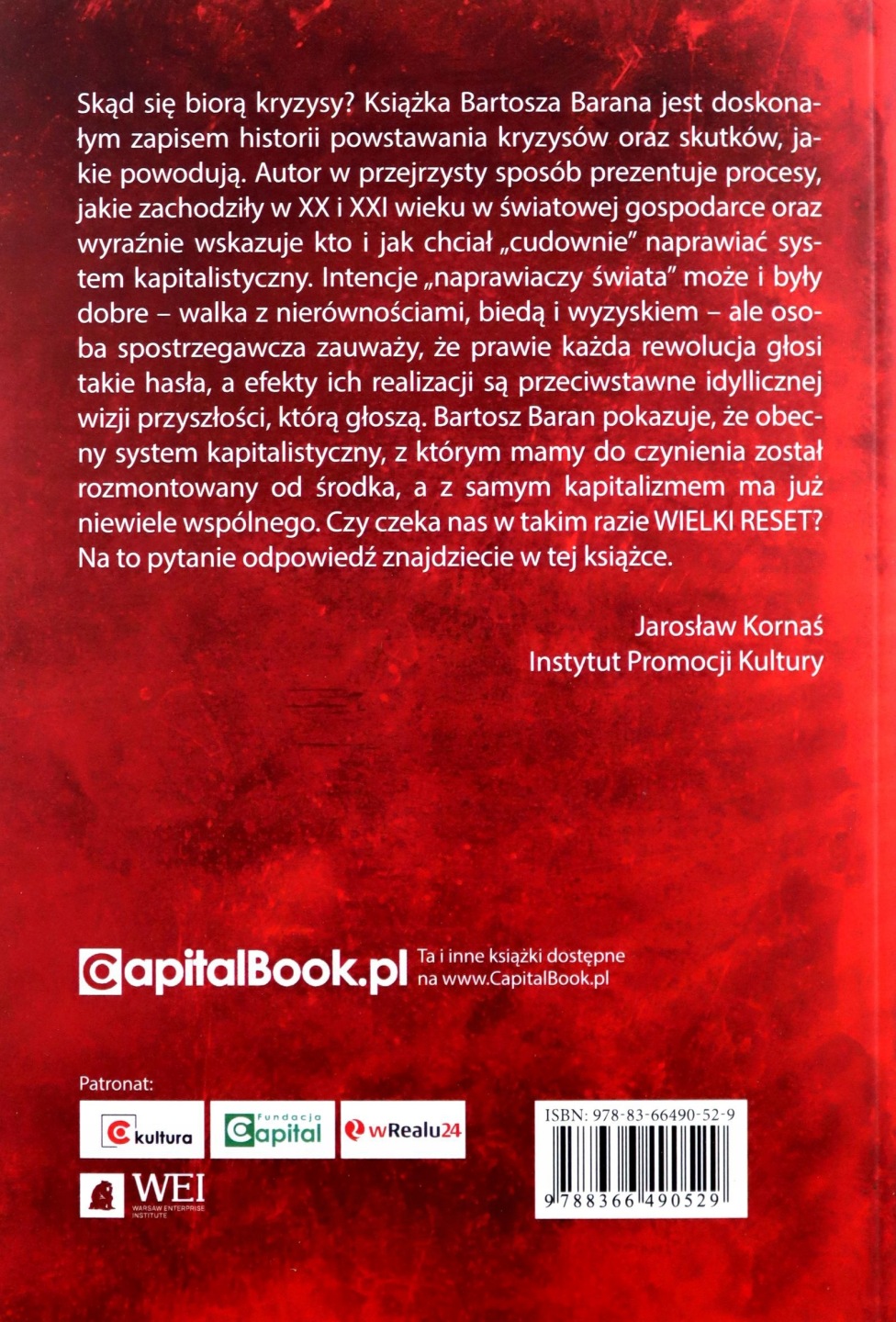 Skąd się biorą kryzysy? Książka Bartosza Barana jest doskonałym zapisem historii powstawania kryzysów oraz skutków, jakie powodują. Autor w przejrzysty sposób prezentuje procesy, jakie zachodziły w XX i XXI wieku w światowej gospodarce oraz wyraźnie wskazuje kto i jak chciał „cudownie” naprawiać system kapitalistyczny. Intencje „naprawiaczy świata” może i były dobre: walka z nierównościami, biedą i wyzyskiem; ale osoba spostrzegawcza zauważy, że prawie każda rewolucja głosi takie hasła, a efekty ich realizacji są przeciwstawne idyllicznej wizji przyszłości, którą głoszą. Bartosz Baran pokazuje, że obecny system kapitalistyczny, z którym mamy do czynienia został rozmontowany od środka a z samym kapitalizmem ma już niewiele wspólnego. Czy czeka nas w takim razie WIELKI RESET? Na to pytanie odpowiedź znajdziecie w tej książce.